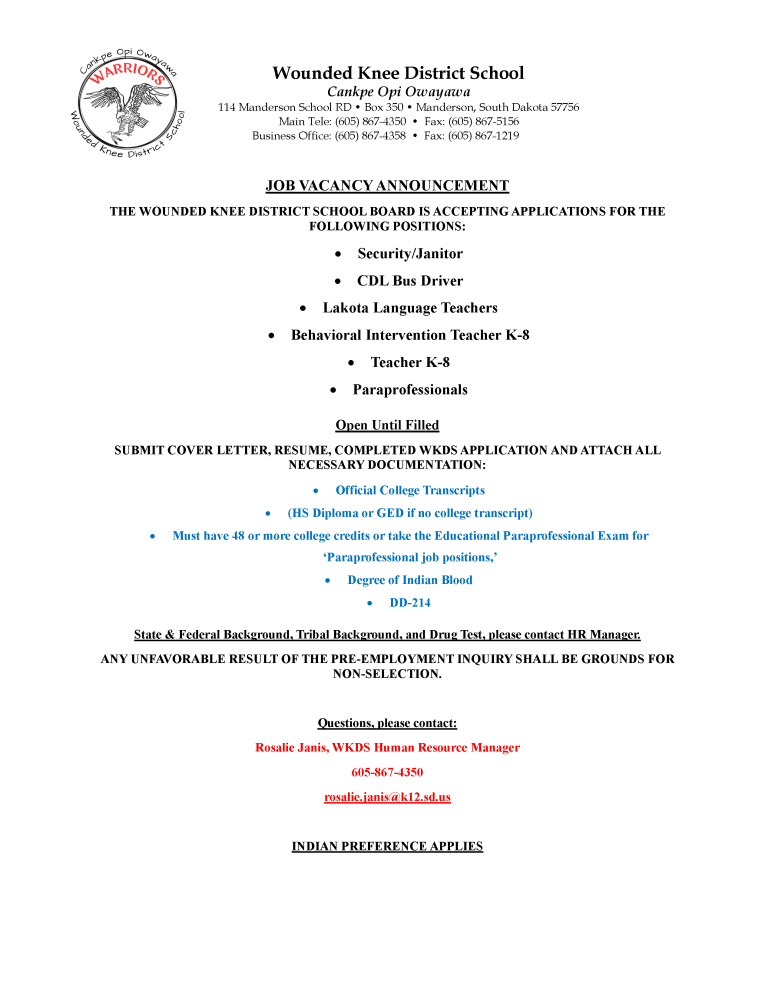 Wounded Knee District School is accepting applications for the following positions: View announcement ⮟