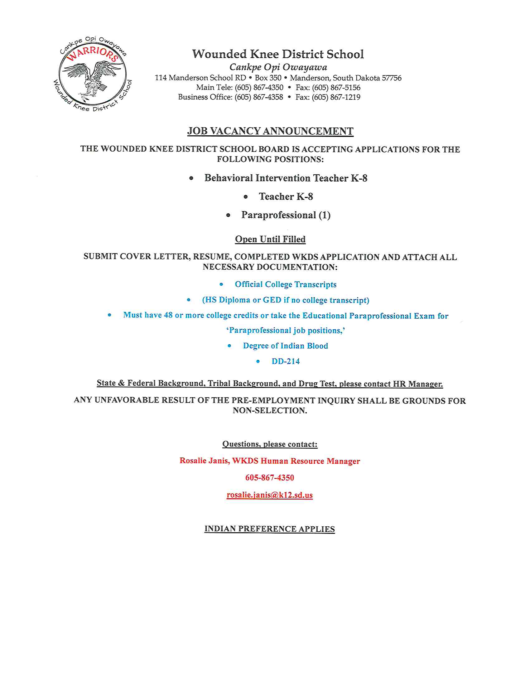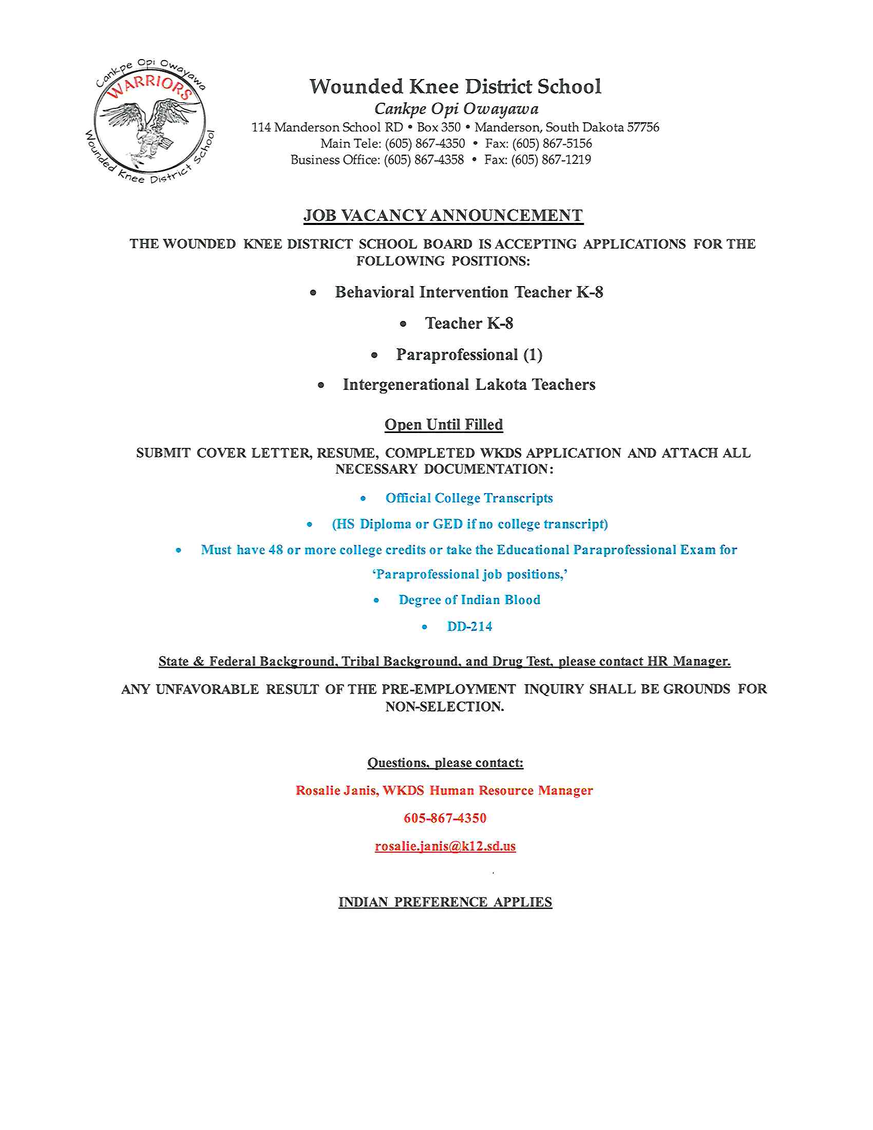 Wounded Knee District School is accepting applications for the following positions: